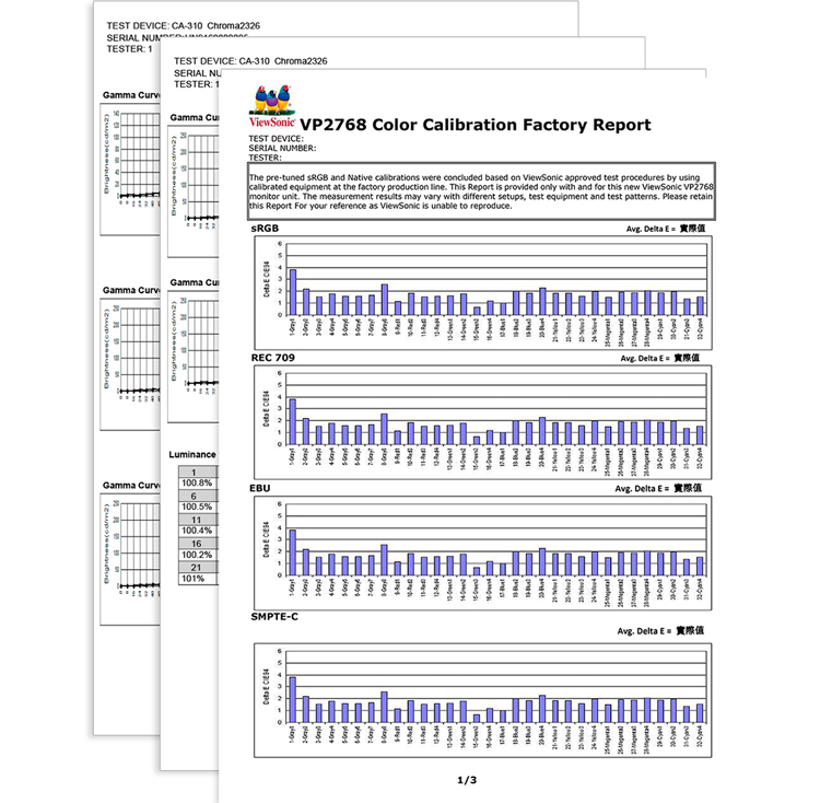 Every unit is pre-calibrated at the factory and comes included with an individualized color calibration report. Each report gives users an individual reading of the panel’s sRGB, EBU, SMPTE-C, REC709, and a uniformity report, giving users 10 more additional item readings than a typical color report. In addition, time spent fine-tuning the VP2768 is four times more than competing brands, bringing our users the highest quality color calibration possible.