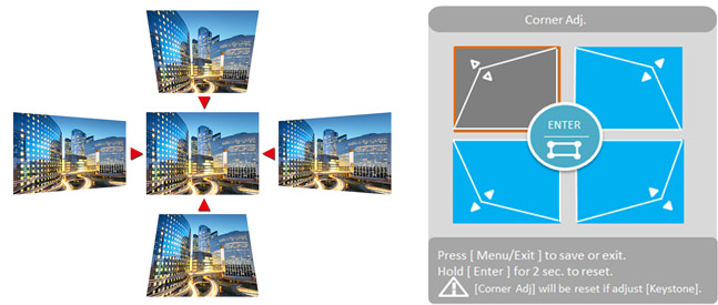 Horizontal and vertical keystone correction with 4 corner adjustment features eliminate crooked and distorted images for a perfectly proportioned picture every time. No matter the size of the room, the projector does not have to be placed directly in front of the projection. When the projector is placed non-perpendicularly to the screen, this feature can still help produce the ideal image quality that supports short-distance projection, provides flexible installation, and saves projection space.