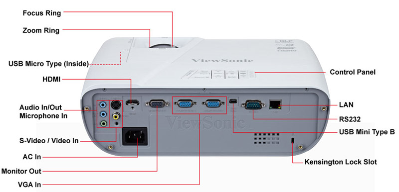 - PACKAGE CONTENTSPower Cord (1.8m) / VGA Cable (1.8m) / Remote Control with Batteries (With Laser pointer) / Quick Start Guide (one sheet version) / ViewSonic CD Wizard (With User Manual) / Cable Cover x1