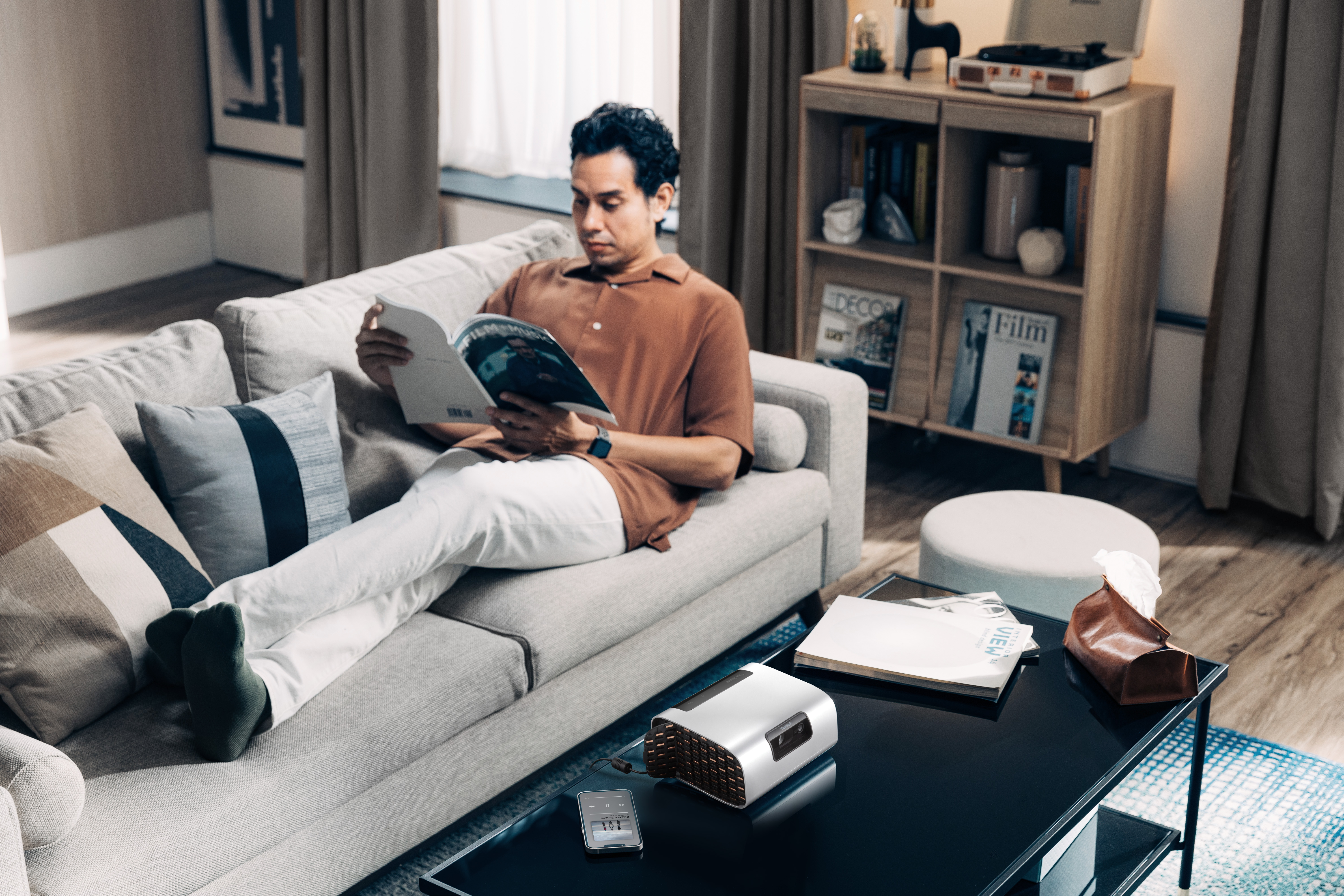 In addition to premium visual performance, the M10 features intelligent auto-setup functions for seamless usage. It adopts ToF technology which enables instant auto focus, ensuring sharp images within seconds after adjusting the projector’s position. Its auto horizontal/vertical keystone allows users to enjoy a hands-free setup, achieving perfectly shaped images whether the projector is projecting from the side or even up onto the ceiling.