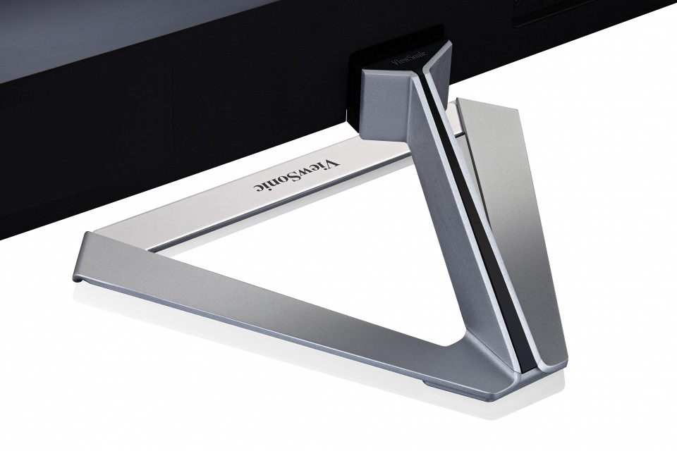 - Frameless bezel and metallic triangle stand