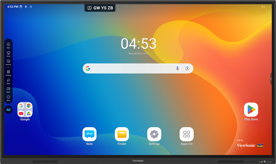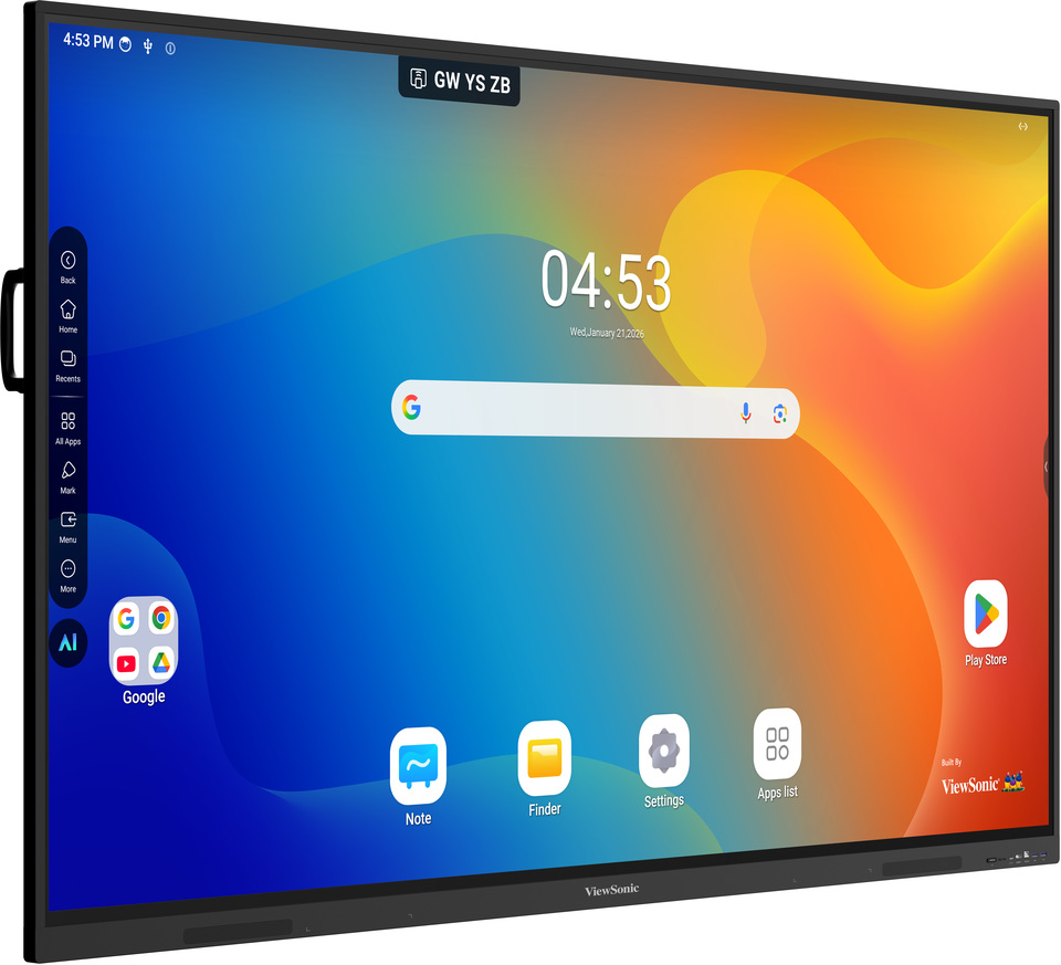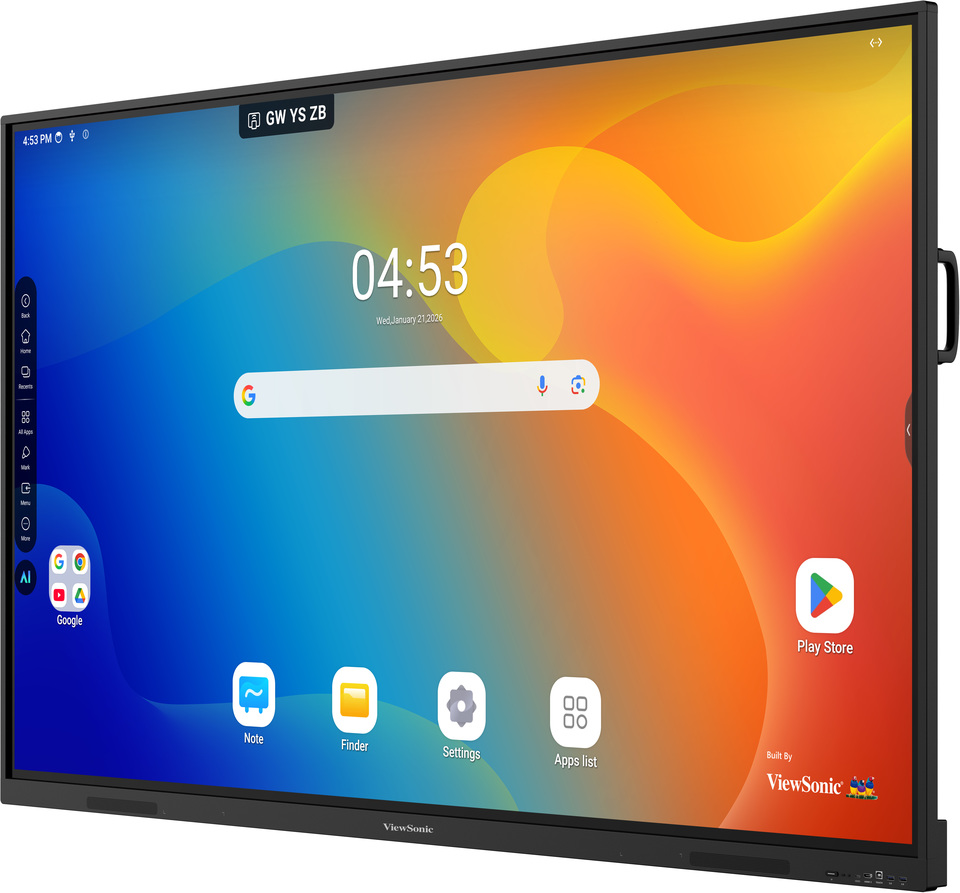 The ViewBoard IN05 series interactive flat panel, powered by the Android™ Enterprise Device License Agreement (EDLA), integrates Android™ 16 and Google Play Store access for secure and enriched learning experiences. It features 4K UHD resolution with advanced bonding technology for vibrant colors and reduced glare. The 50-point Ultra Fine Touch touchscreen enables intuitive collaboration with fingers or dual-tip pens, while built-in speakers and one USB-C port enhance user convenience.