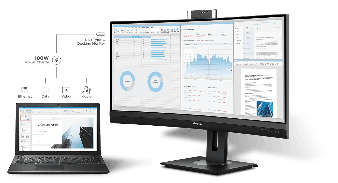Die Docking-Funktion des VG3457CV vereinfacht Ihren Arbeitsalltag, indem sie externe Adapter überflüssig macht. Über USB-C übertragen Sie Daten, Video, Audio und laden Geräte mit bis zu 100 W – ergänzt durch einen integrierten RJ45-Anschluss für eine stabile und schnelle Netzwerkverbindung.