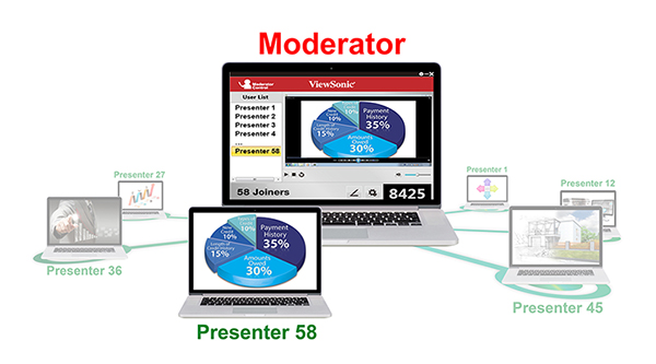 Avec un logiciel de présentation groupé, cela aide l'hôte de la présentation pour augmenter les capacités d'interaction dans des environnements de classe/réunion à grande échelle. Le mode Modérateur permet plus de 50 connexions simultanées à partir des PC ou des Notebooks des participants L'hôte peut prévisualiser tous les écrans connectés avant la diffusion, et peut choisir tout écran relié pour présenter. En quelques secondes, les idées du présentateur choisi peuvent être partagées par tous.