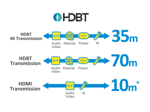 Dank der HDBT Technologie kann das Set unkomprimierte HD-Videos und -Audios über ein Netzwerkkabel übertragen, es eignet sich daher perfekt für die Übertragung von Inhalten über eine große Entfernung zu Ihren Anzeigegeräten.