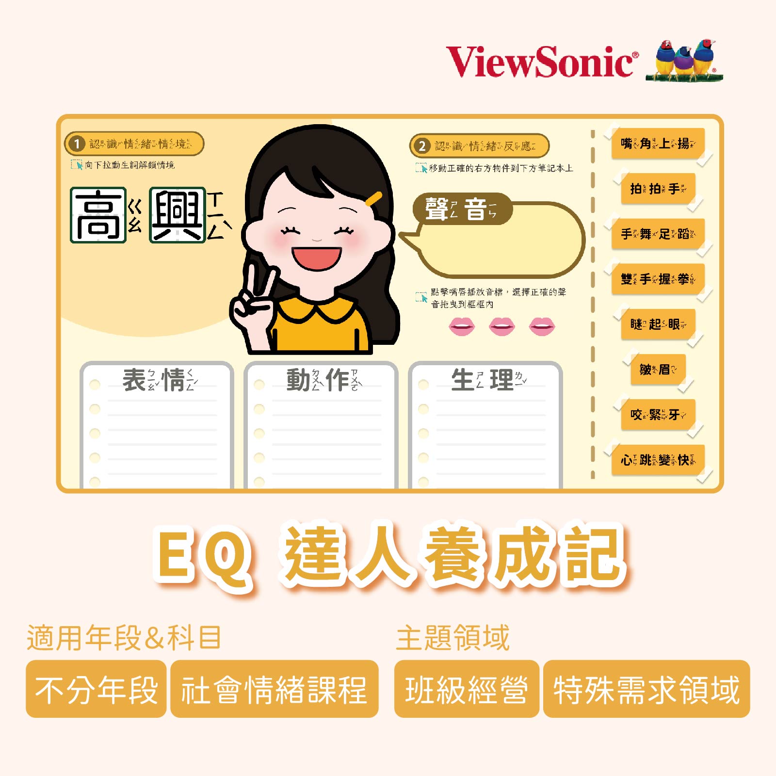 【EQ 達人養成記】課程以 108 課綱之特殊需求領域-「社會技巧」中三個向度:處己、處人與處環境為主軸,涵蓋認識情緒概念、覺察情緒、處理情緒技巧等學習內容。並以 myViewBoard 科技輔助工具為載體,藉由數位操作介面增加互動性。透過具體呈現的鷹架,帶領學生認識不同情緒,最後學習在不同情境下運用多元情緒管理的策略,逐步培養健全的情緒素養,為孩子未來的社會人際互動奠定良好的發展基礎。