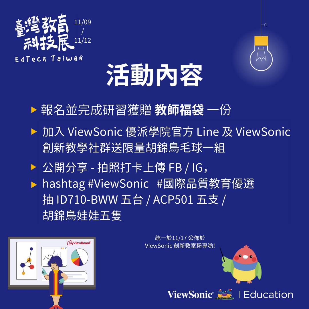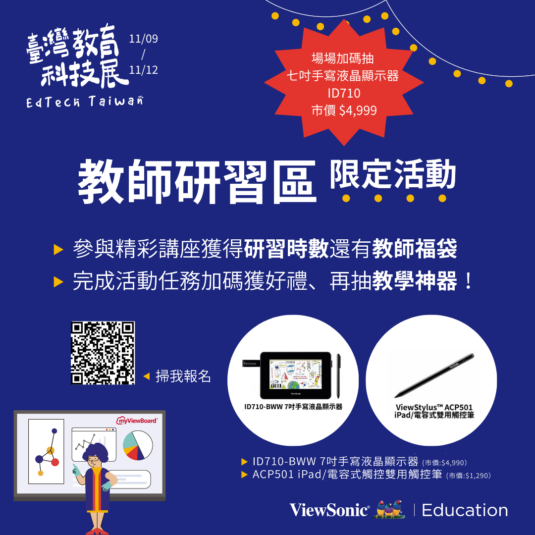 【科技教育的偉大航道:與 ViewSonic 一起尋找教學大秘寶】是最平易近人的 myViewBoard、ClassSwift 數位工具融入教學示範,一起來體驗 ViewSonic 團隊為老師們準備的原創教材與創意發想吧!