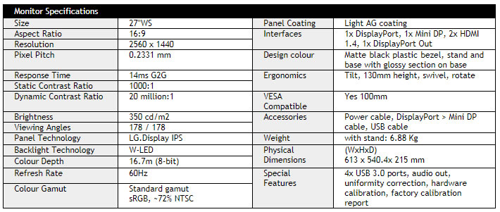 The VP2768 offers a decent range of connectivity options with 1x DisplayPort 1.2, 1x Mini DisplayPort and 2x HDMI 1.4 connections offered. There is also a DisplayPort out connection for daisy-chaining multiple displays if you need. The digital interfaces are HDCP certified for encrypted content and the video cables are provided in the box for DisplayPort to Mini DP only.
