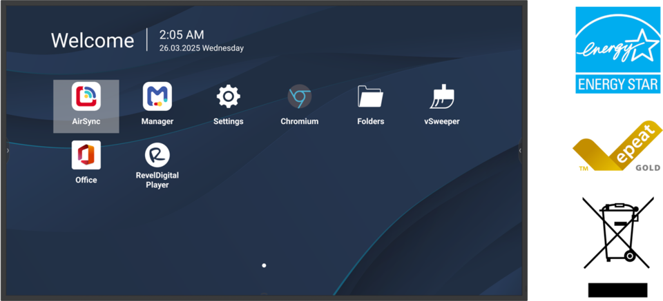 Diseñada pensando en la sostenibilidad, la serie CDE31 es la primera pantalla de gran formato en obtener la certificación EPEAT Gold. En combinación con el cumplimiento de la normativa ENERGY STAR, ofrece a empresas, escuelas e instituciones una solución energéticamente eficiente que reduce el impacto medioambiental sin renunciar al alto rendimiento.