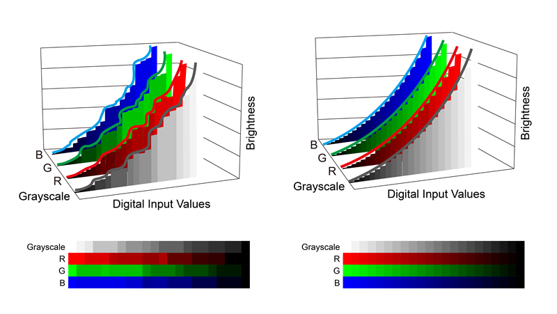 Gamma curve importance stems from the need of smooth gradation between colors and color correction. As technology has improved, internal gamma correction features have been incorporated into LCD monitors, which apply multi-gradation to colors and correct the color information. With 10-bit color processing (approximately 1.07 billion colors) and an enhanced LUT processor, screen gradation and color reproduction can be dramatically improved. To improve gradation further, subjugating an eight-bit count input signal to a 14 or 16 bit calculation can help improve the reproduction of darker tones, improve intermediate color gradation and produce higher quality, more precise color output.