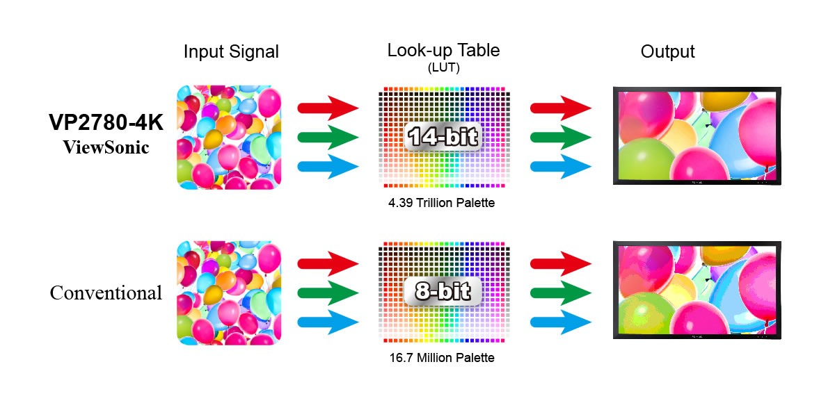 The advantage of having a higher bit count (14-bit) is even more precise tonal transitions and an increase in available color palate. That ability makes a higher bit LUT very desirable because the increase in amount of colors creates smoother color transitions, especially in darker gradient transitions. Using a high bit LUT is perfect for ideal color management use, aiming at programs that require high-performance color. A higher bit count also creates more precise gamma transitions, increasing the smoothness of gray-scale representation. This RGB blending helps users precisely match their color needs, while decreasing color error and accurately reproducing color input. With an advanced ViewSonic 12-bit color engine, color displays will output even more, utilizing a larger color palate and even if the input signal from the PC is at a lower bit rate, you will still receive better color reproduction due to the higher bit rate and advanced LUT. In addition, using an enhanced 12-bit color engine and scalar increases color accuracy and lowers the delta E number, giving an increased color palate and amazingly accurate reproduction.