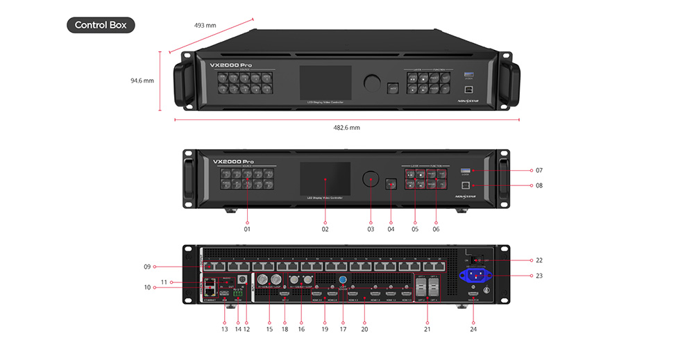 Le LD-SCB-024 présente une conception pour montage en rack 2U, assurant une compatibilité parfaite avec les armoires serveurs standard. Son format compact et peu encombrant simplifie le placement, rationalise la configuration et améliore l'efficacité de l'installation, ce qui en fait un choix idéal pour les environnements audiovisuels professionnels.