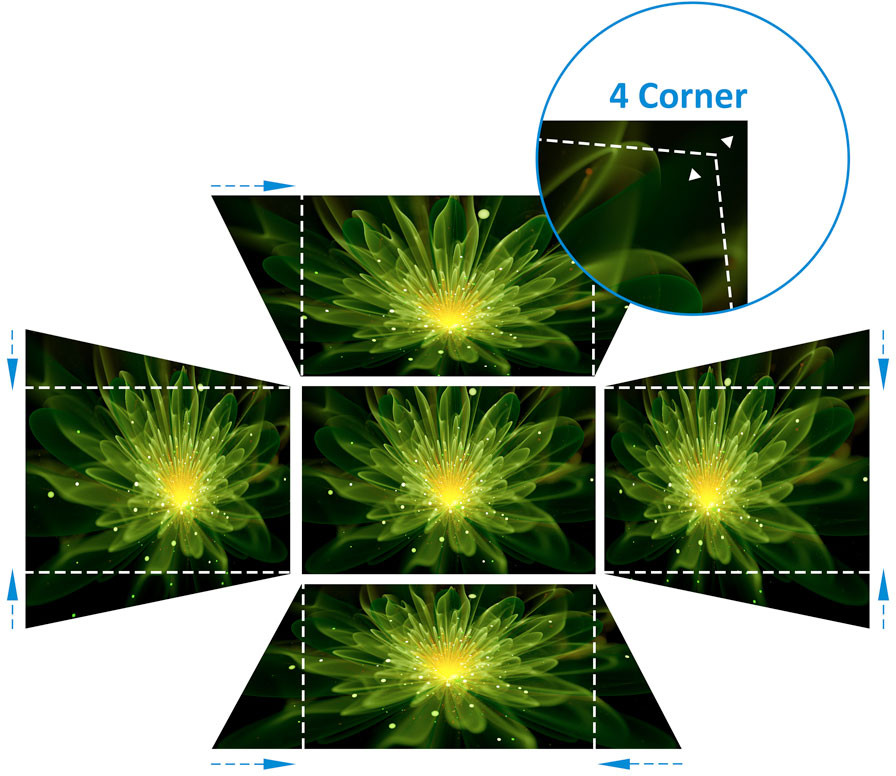 La correction trapézoïdale horizontale et verticale ainsi que la fonction de réglage des 4 coins éliminent les images tordues ou déformées pour une image parfaitement proportionnée à chaque fois.Keystone H/V