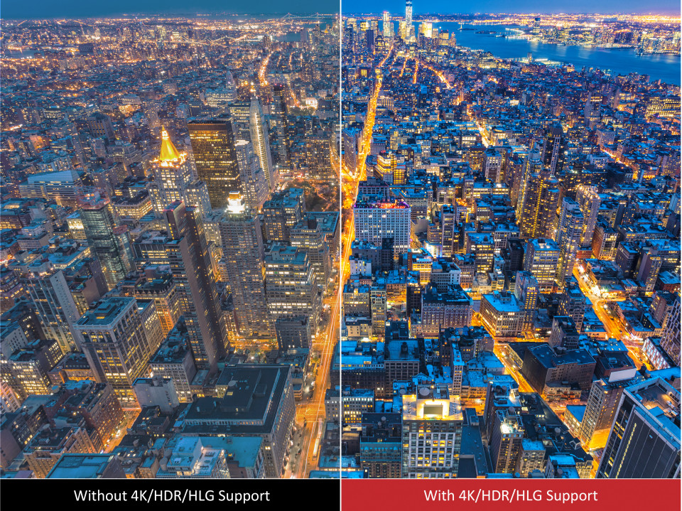 Il est équipé de deux ports HDMI 2.0b / HDCP 2.2, garantissant votre accès au contenu original de qualité 4K avec HDR/HLG pris en charge à une fréquence d'images de 60 Hz à partir de périphériques externes (par exemple, une clé Roku, un lecteur Blu-ray 4K), produisant les blancs les plus brillants, les noirs les plus profonds et montrant plus de détails dans l'image.Support 4K/HDR/HLG