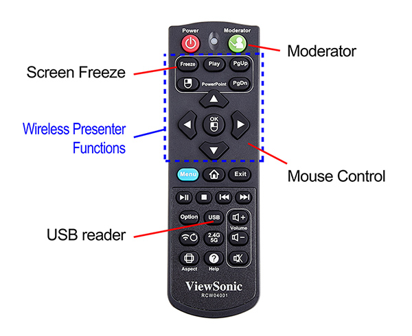 La recherche d'une fonction dans le menu à l'écran peut être longue et fastidieuse. Pour faciliter les choses, cette télécommande contient des raccourcis clavier pour des fonctions majeures et essentielles. Les fonctions majeures incluent le Modérateur, le lecteur USB, et des fonctions de présentateur sans fil (contrôle de la souris, page avant, page suivante, gel de l'écran, etc.).