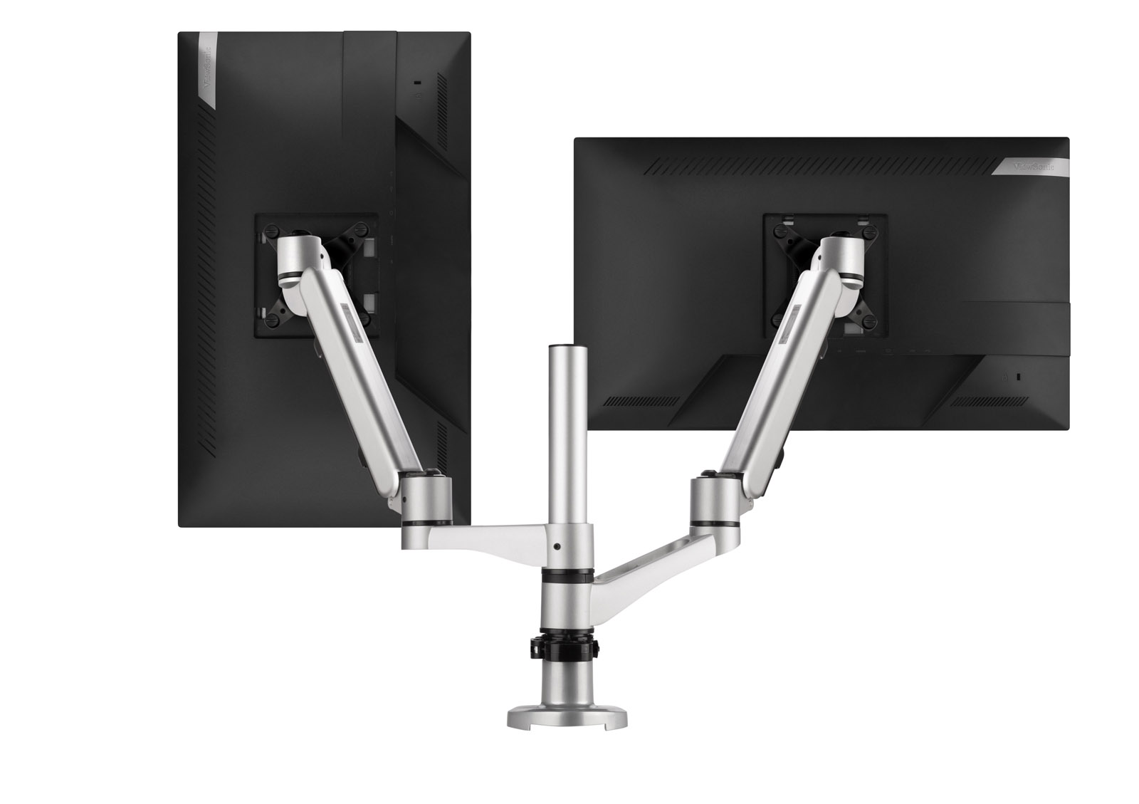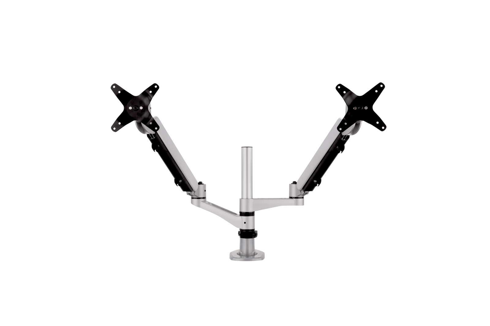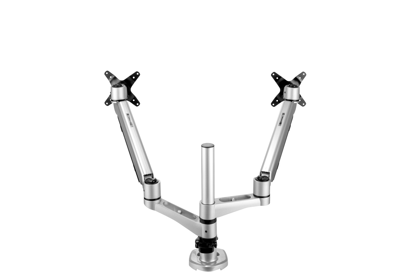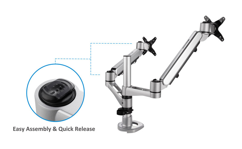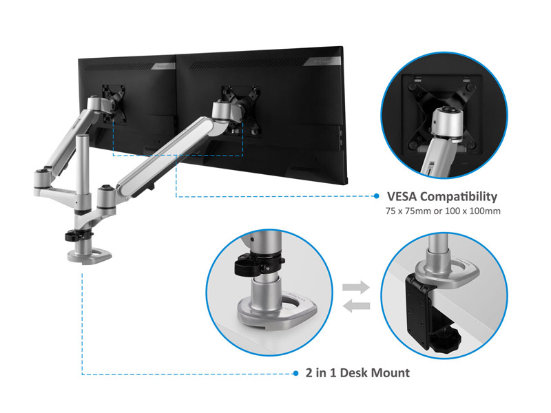 2 in 1 desk mount with clamp and grommet option that supports up to 27” monitors. The dual monitor arm can adapt to almost all types of office desks with 75 x 75mm or 100 x 100mm monitor mount that is VESA compatible, aimed to increase workspace efficiency.