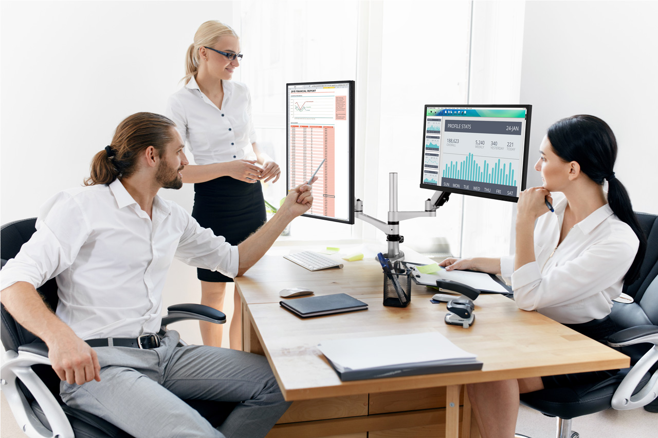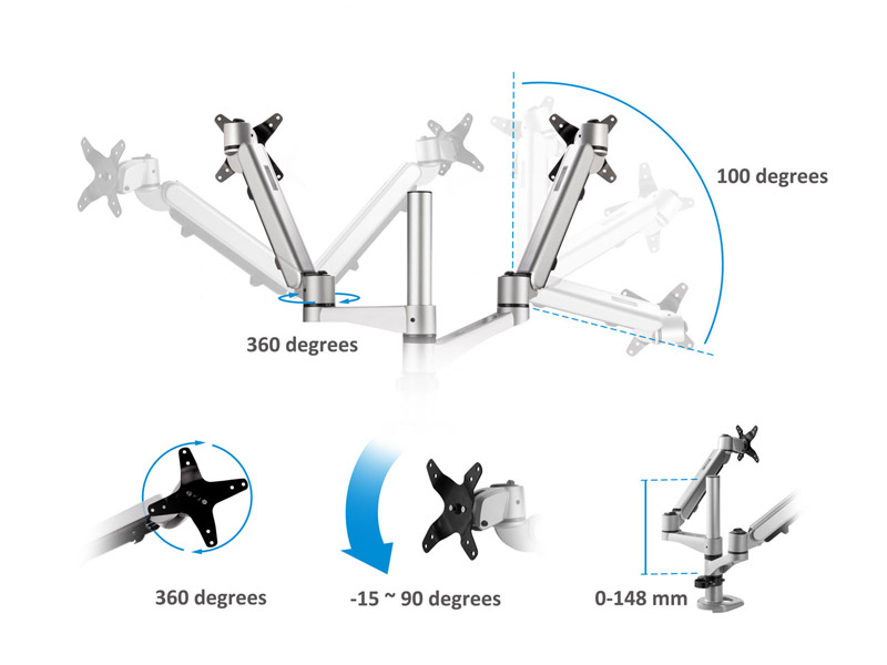 The ergonomically friendly wire spring hovering system easily adjusts monitor height with lift distance from 0 to 148mm. Both arms can amazingly swivel and pivot 360 degrees for landscape, portrait, or hybrid setup to support an ergonomically correct workstation. Enjoy quality workplace collaborations and discussions where monitors are easily accessible for all parties; whether you’re standing up, sitting down, looking left, or looking right, you’ll always be in the zone to take on any tasks. What’s more? A -15 ~ 90 degrees tilt with an adjustable angle setup (up to 100 degrees) makes this a perfect workplace companion, anywhere from your desk.