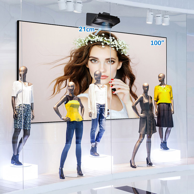 0.23 ultra-short throw lens allows for simple and flexible set up. Placing it as close 21cm away from a wall will project a 100” image and give the projector a subtle presence.