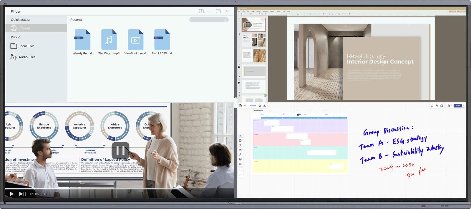 Enhance meetings and collaborative sessions with multi-window and split-screen modes. Utilize multi-window mode to display up to four windows simultaneously for a comprehensive document overview during brainstorming sessions. Sketch on the board or share resources while simultaneously monitoring the ongoing video conference in split-screen mode.