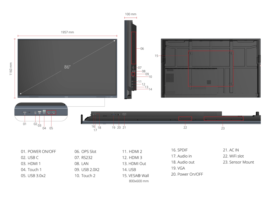 1. 3m power cord by ship area 2. Remote control with AAA battery 3. 3m touch USB cable 4. Touch pen x 2 (VB-PEN-009) 5. Quick Start Guide + Compliance statement 6. RS232 adapter 7. Clamp x 5 8. Camera Plate 9. Screw x 8 (camera 2+2, wall mount 4) 10. HDMI cable 3m