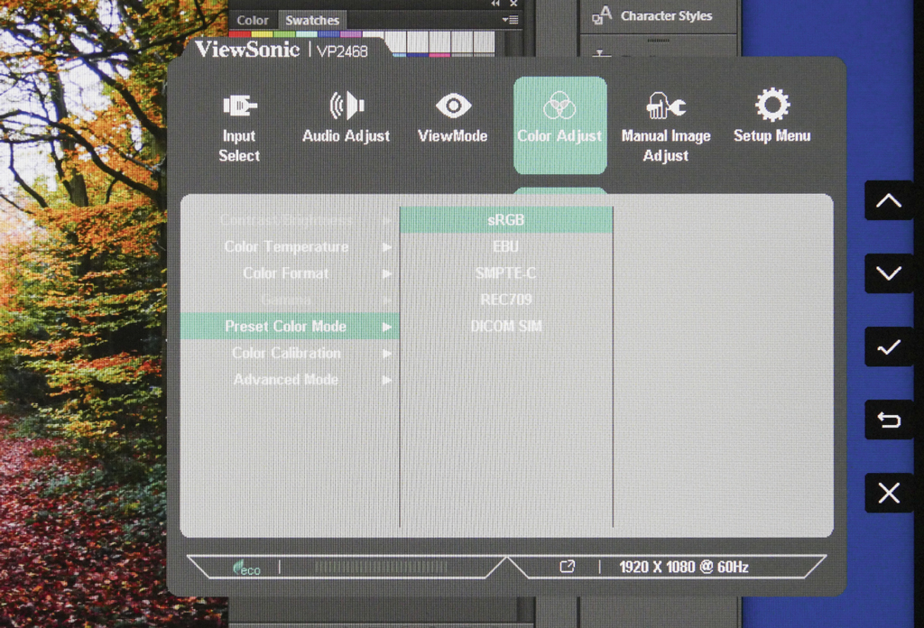 Press any button to bring up the OSD menu. The top option is the Pre-set Colour Mode, which has several options, including sRGB, EBU, SMTE-C, Rec 709, DICOM SIM, Native, Cal 1, 2, 3 and Advanced mode. Use the buttons adjacent to the arrow keys to scroll through the various colour settings and press the tick button to apply the setting. I am surprised that the Adobe RGB colour space is not included with this list, as this would be an essential requirement for many professional photographers. However sRGB is the default colour space for most applications, including digital cameras, inkjet printers and internet. EBU, SMPTE-C, Rec 709 are colour spaces used for video production, and the DICOM SIM mode is mainly used when colour correcting files for digital projection. The Native setting is the factory default. Cal 1, 2 and 3 can be assigned to your own custom settings.