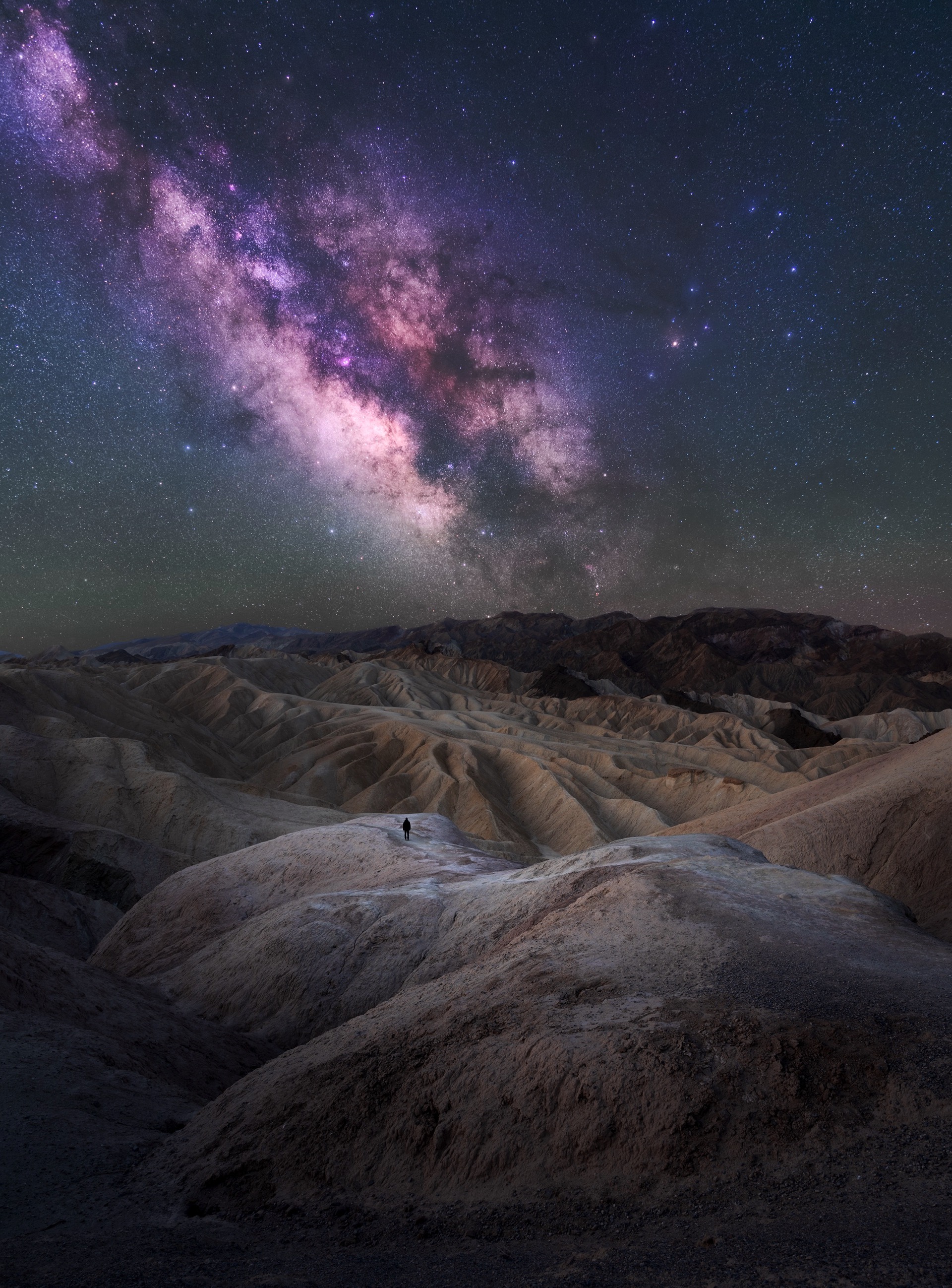 An otherworldly rock spire (also known as a hoodoo) rises out of the badlands, forming a perfect foreground to the Milky Way galaxy above. The surrounding area has eroded over thousands of years, leaving this strange formation as a testament to resilience in the face of the forces of nature.