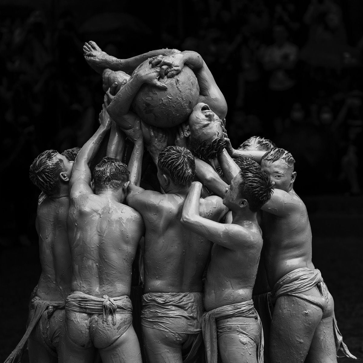 Teammates lifting a victorious man high above their heads amidst the mud and cheers of the Van Village mud ball wrestling festival, Bac Giang province, Vietnam. The theme of ”rise” resonates deeply in this context. It signifies not only the physical elevation of the triumphant wrestler but also the collective rise of the team's spirits, their shared joy, and their mutual support for one another. It symbolizes the strength of unity and the capacity of individuals to overcome obstacles when they work together toward a common objective.