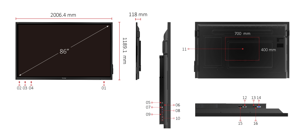 | Contenuto della confezione: | 1.US/EU/UK/AU cavo di alimentazione 3M, senza sacchetto PE 2. QSG 3. Dichiarazione di conformità 4. Cavo HDMI 3M*1 5. Cavo Touch USB 3M *1 6. PENNA tattile *2. Punta extra: spessa*2, sottile*1 7. Telecomando con batterie AAA (versione VS) 8. Piastra per webcam con pacchetto di viti a. Necessità di compatibilità con Logi CC4000e) b. fori per le viti sulla parte superiore del telaio 9. Vassoio portapenne*1 (due penne, rimovibili, montaggio per entrambi i lati) 10. Viti per il montaggio a parete |