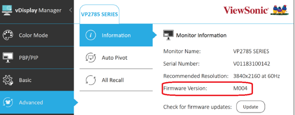 1. Quando ti trovi su Monitor, vai su OSD -> Menu Impostazioni-> Informazioni, lì vedrai la versione attuale del firmware.