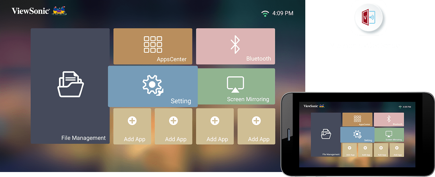 ViewSonic vCastSenderアプリをスマートデバイスにダウンロードし、スマートデバイスとプロジェクターを同じWi-Fiネットワークに接続してアプリでペアリングをすると、モバイルデバイスを強力なリモコンに変えることができます。