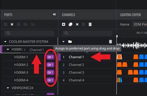 채널을 클릭하여 장치 이름 위로 끕니다. 예: 채널 1을 장치 H500M으로 끌면 H500M 아래의 모든 포트가 채널 1 RGB 시퀀스를 활성화합니다.
