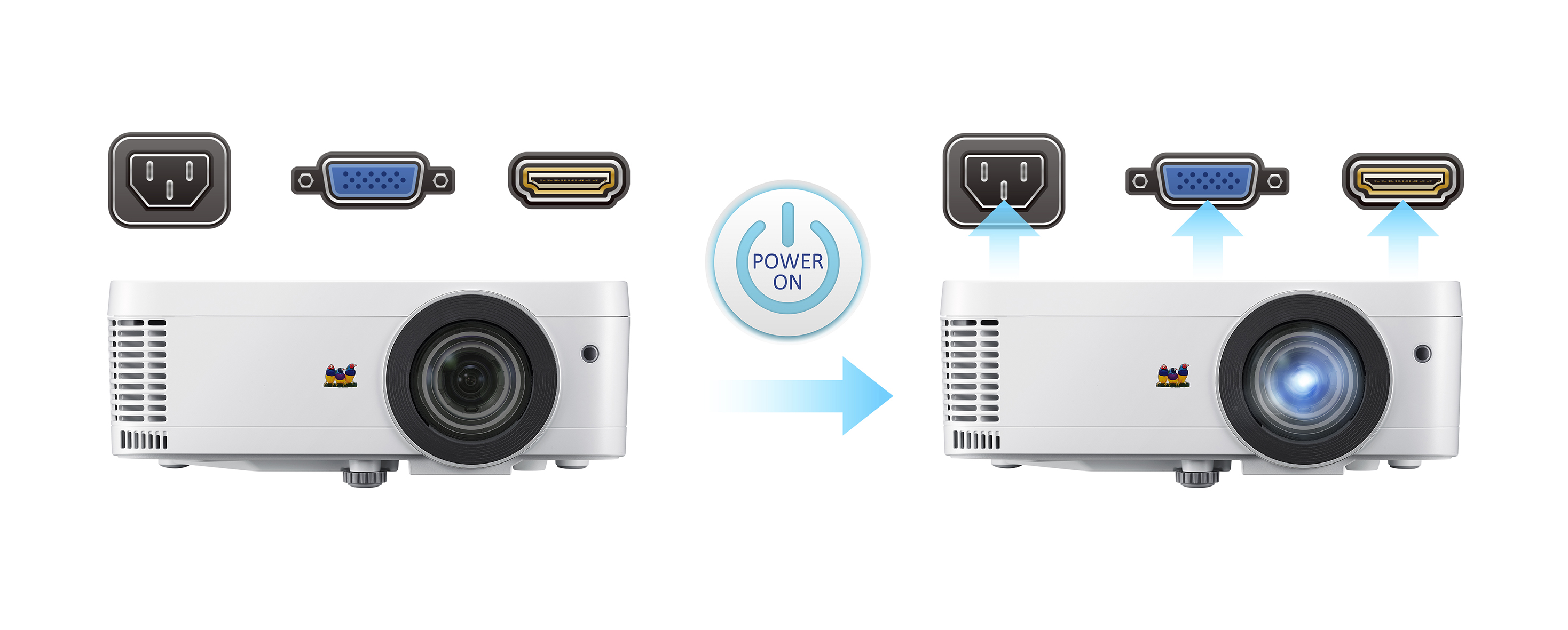 두 가지의 간단한 설정을 통해 프로젝터를 즉시 구동 및 실행 가능합니다