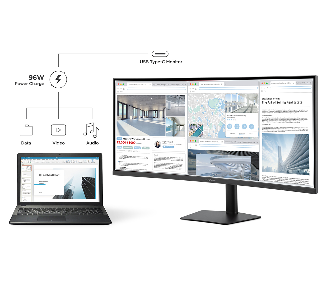 This monitor allows for a streamlined workflow and eliminates the need for dongles and plug-in attachments. USB Type-C offers seamless video, audio, and 96W power delivery, meaning no additional power cable is needed for your laptop.