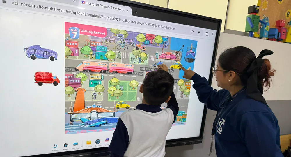 Las pantallas interactivas se integraron con cámaras, micrófonos y el software myViewBoard, lo que permitió clases híbridas en tiempo real y la incorporación de múltiples recursos digitales. “Los profesores pueden escribir sobre documentos, resolver ensayos directamente en la pantalla o abrir videos de YouTube para ilustrar conceptos. Eso da una enseñanza más interactiva y visual”, comenta Cathia. Además de mejorar la experiencia pedagógica, la tecnología también comenzó a usarse en procesos internos, como las presentaciones a apoderados durante las matrículas, mostrando el servicio de Gauss directamente en las pantallas interactivas.