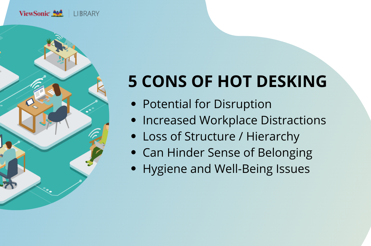 Hot desking is becoming a hot topic among companies. Allowing people to work at any available desk or workstation might first appear as an intriguing concept, but always more workplaces are making the leap. While this practice has a lot of potential benefits, it would be too good to be true if it didn’t have any possible drawbacks. In this read, we’ll break down the pros and cons of hot desking for you to decide which side you’re on. Read on to learn more about hybrid offices, hot desking, as well as the pros and cons of this practice. Or discover ViewSonic’s solutions for the workspace. Hybrid offices, where some employees work on-site and others work remotely, are becoming the next new thing, and hot desking is a popular practice in such workplaces. In many ways, this makes sense, as hot desking offers greater flexibility, amongst other advantages. But employers do need to think carefully about whether it is right for them and their employees. Over the next few lines, we’ll explore the concept of hot desking more in depth, how it relates to hybrid work, and why it is becoming such a common feature in modern workplaces. We will then have a look at 5 pros and cons of hot desking and review advantages as well as potential drawbacks associated with this practice. Hot Desking and Hybrid Workplaces Hot desking can be defined as the practice of not assigning employees their own individual desk, but instead allowing them to work at any available workstation. It has grown in popularity since the 1990s, coinciding with the rise of open-plan offices. But the policy itself continues to divide opinion among employees and employers alike. Workspace Collection Designed to drive productivity See all > In hybrid workplaces, where staff are given the freedom to either work on-site or work remotely, hot desking can make a lot of sense. After all, a cornerstone of the entire hybrid work model is flexibility, and assigning people an individual workstation when they may not even attend the workplace can be seen as a waste of office space. Nevertheless, it is a good idea to carefully consider both the pros and cons of such an approach. 5 Pros of Hot Desking The growing popularity of hot desking is directly linked to the various benefits it can deliver. In this section, we explore five advantages associated and why they’re so appealing for modern professional environments. 1. Suitable for Hybrid Offices A major plus point associated with hot desking is the fact that it is highly compatible with hybrid approaches to work. When employees have the flexibility to move between working from home and working in the office, it can often work out well to provide flexibility in terms of seating too. Not only is this in keeping with office design trends, it is also a sensible policy to avoid allocating desks to people who are not necessarily going to be in the office every day. 2. Encourages Collaboration Some advocates of hot desking argue that the arrangement can encourage collaboration by facilitating the employees to interact with different people rather than speaking to the same colleagues every day. Of course, in a hybrid work model, this will only be relevant to those in the workplace rather than those working remotely. Nevertheless, it can be a useful advantage, helping to spark the kind of fresh discussions that lead to innovation and improvements. To foster this collaboration, adapted visual solutions are key. Given the mobile and versatile nature of this work style, USB-C monitors (either stationary or portable) will allow anyone to directly connect and charge their laptops. Interactive displays like this one placed at strategic points throughout the office (meeting and huddle rooms, common areas…) will also help create a link between on-site and offsite employees. Workplace Ergonomics USB-C for plug-n-play productivity Discover the VG2455 > USB-C Monitors Ultimate connectivity Learn more > Portable Monitors Work Wherever Life Takes You ViewSonic VG1665 > 3. Cost-Effective and Space-Saving Among the biggest arguments in favor of hot desking is its ability to save space and, therefore, money. In fact, moving to an open-plan, hot desking layout can save as much as 30 percent on the costs of running an office, with the savings especially apparent in workplaces that previously used cubicles or private office space. In hybrid workplaces, fewer desks are required because some staff will be working off-site at any given time. 4. Provides a Level Playing Field While it may not suit every workplace or fit with every corporate culture, another positive aspect of hot desking can be the way that it provides a level playing field. People sit together and work alongside each other, regardless of where they are in the company hierarchy. This can be good for everything from onboarding new recruits to creating the sort of work environment where people feel comfortable with sharing their ideas. 5. Can Make the Office Tidier One of the more overlooked plus points associated with hot desking is its potential to make the office a tidier place. The explanation here is simple – when people do not have their own dedicated desk spaces, they do not tend to leave things lying around in the office. Personal workstations can quickly and easily become cluttered over time, which has been shown to impact productivity, what can also make the workplace a lot less appealing to look at. 5 Cons of Hot Desking Although there are some significant benefits associated with hot desking, it is also worth taking into consideration the negatives too. In this section, we look at some of the possible disadvantages. 1. Potential for Disruption Among the biggest arguments against hot desking is its potential to cause disruption in the workplace. When people are not guaranteed their own workstation, they may waste time looking for an available desk and then setting things up the way they like them. Sitting around different people each day can