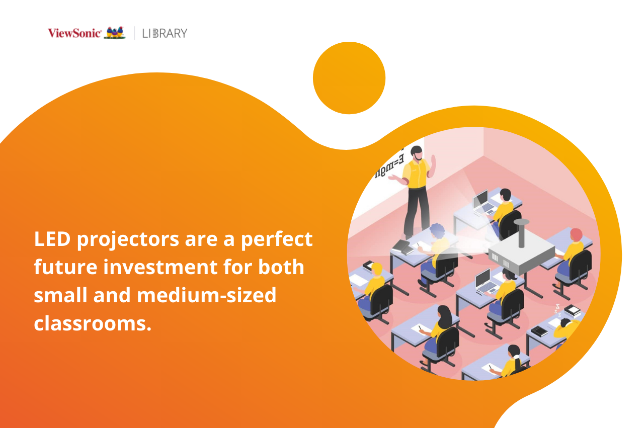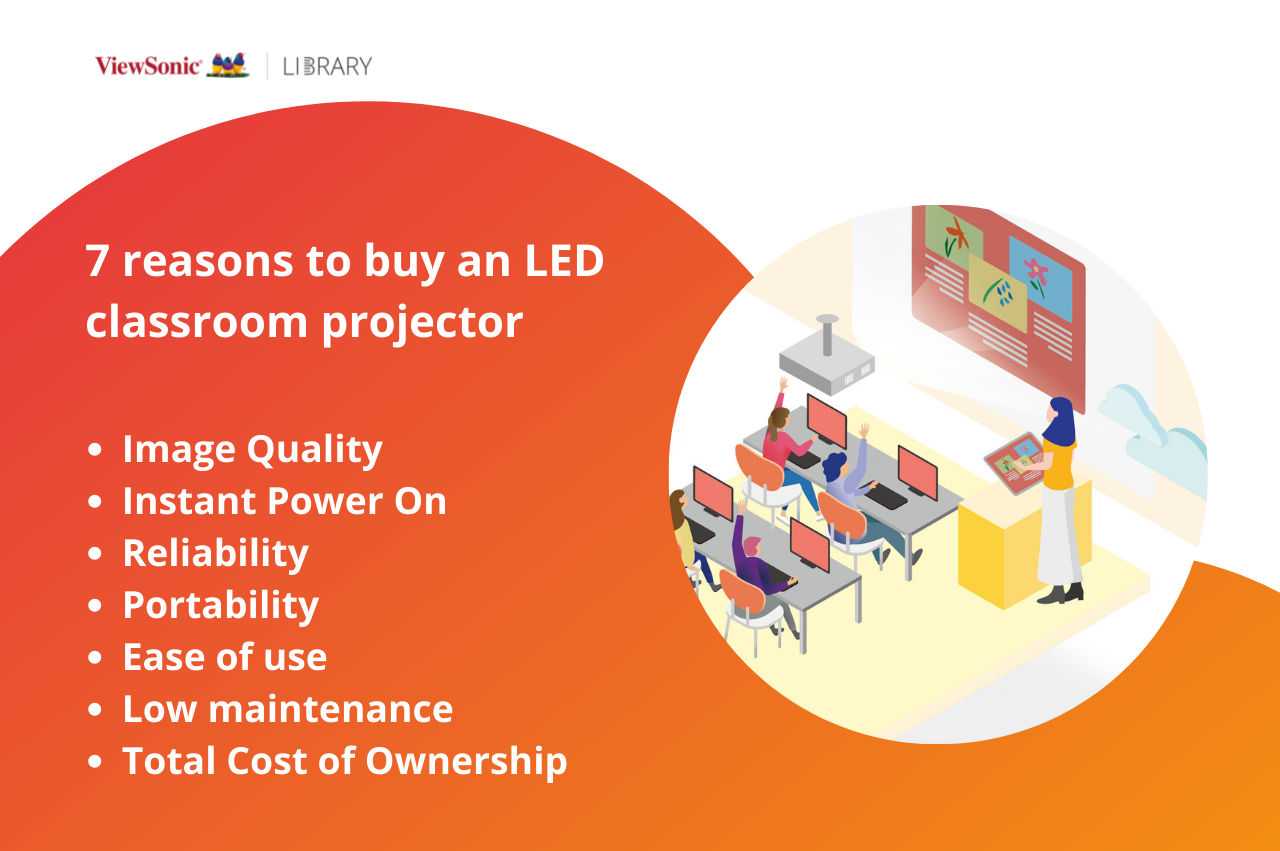 An LED classroom projector is arguably one of the most convenient ways for a teacher to display visual content. Although this new type of projectors has only been around for a few years, it’s steadily winning over the familiar lamp projectors. This new iteration brings a lot to the table thanks to operational ease, low maintenance, and technological advancements. Still wondering which kind of projector you should pick for your school? Well, here are 7 reasons why LED projectors are the solution. Keep on reading to learn more about the benefits of LED projectors in the classroom, or discover ViewSonic’s solutions for education. Projectors are, nowadays, very common classroom equipment. They are a remarkably convenient tool for teachers to present content, be it to hundreds of students or small classes. Until recently, lamp and laser-based projectors accounted for the vast majority of models found in schools. But given the swift rise of LEDs and the recent development of this technology, LED classroom projectors are becoming a very interesting alternative. Let’s have a look at the advantages they offer to help you to make a solid and informed decision. Understanding Classroom Projectors Displaying content has huge benefits when it comes to teaching a class. No wonder, then, that display devices have been constantly developing to play an ever-increasing role in the classrooms over the last decades. Overhead projectors, TVs, VHS players, and interactive whiteboards, all found their way into modern teaching strategies. But, even if the interactive displays are experiencing real momentum, the projectors still remain a convenient and economical solution for most school classrooms. In the education realm, we currently find three main types of projectors: lamp-based, laser-based and LED based. Each type is defined by its light source, and all of them have their own advantages in different settings. The ultra-bright laser projectors, for example, are especially well suited for large venues like amphitheaters and large auditoriums, while lamp and LED projectors are perfect for small and medium-sized classrooms. Classroom Projectors Find the right classroom projector See all > 7 benefits of an LED Classroom Projector Chances are you’re already well acquainted with lamp projectors, but still a bit in the dark regarding the benefits of having an LED projector in your classroom. Let’s have a look at the 7 main reasons why these new models are perfect for your classroom. 1. Image quality LED classroom projectors provide an enhanced viewing experience, keeping eye care in mind. Since they produce a better perceived brightness thanks to higher color saturation, they can even be used in environments with lots of ambient light. Interestingly, the bright and vivid images don’t take the same health toll that some displays do. Indeed, since the images are mediated by a wall or another surface, the blue-light emissions are reduced to a minimum. And as LED projectors don’t use color wheels to produce images, the irritating rainbow effect usually encountered when using a lamp projector is no longer an issue. 2. Instant Power On One of the main benefits of an LED classroom projector is its instant power-on feature. Lamp-based models need to warm up first – which can take from a few seconds up to a few minutes – to become fully operational. But since LEDs produce a steady beam of instant light, they’re ready to go right off the bat. In a classroom setting, this feature really goes a long way. No more wasting precious class time waiting for the projector to finally display the desired content. No more risking havoc in the classroom while setting up the presentation. Turn on the LED projector, connect your device, and the class can seamlessly continue without any interruption! 3. Reliability LEDs don’t just allow for instant power on, their lifespan is also much longer than the one of the mercury lightbulbs used by the lamp projectors. And since LEDs don’t generate heat like lightbulbs, there’s no more need for a big and noisy fan like back in the days. And the newest models come sealed in an IP5X case, preventing dust from affecting the optical engine and thermal system. Moreover, LED projectors aren’t subject to brightness and color decay like their lamp-based counterparts. With time and use, especially when the lamp projector isn’t set in Eco mode, the lightbulb’s brightness will start to diminish, resulting in the color fading. LEDs, on the other hand, steadily produce the same brightness over time, bringing in a more reliable color output in the long term. 4. Portability As LED classroom projectors don’t need to be geared with a big fan to dissipate heat, they now also come in a more compact format. This results in a new breed of portable projectors, in addition to the familiar stationery ones. These offer similar specs as the regular projectors but come equipped with high-quality integrated speakers, a Wi-Fi connection, and (when it comes to portable projectors) a powerful battery pack. These projectors can be, therefore, used both in the classroom and on field trips. Moreover, as they easily fit into a backpack, they can also be assigned directly to the teachers instead of a specific classroom, allowing for greater flexibility when designing classrooms. LS550WH 2,000 ANSI Lumens LED Projector See Product > M2 Teachers' portable projector See Product > LED Projectors Projectors for education See All > 5. Ease of use Whether in its portable or regular form, an LED projector is amazingly easy to use in a classroom setting. Its comprehensive connectivity, with HDMI, VGA, and USB ports, enables the connection of any electronic device. The most advanced models are also compatible with wireless HDMI dongles to cut down on cable management. With instant power on and a comprehensive keystone correction, LED projectors now allow for a perfect image within seconds. Once you’re done usi