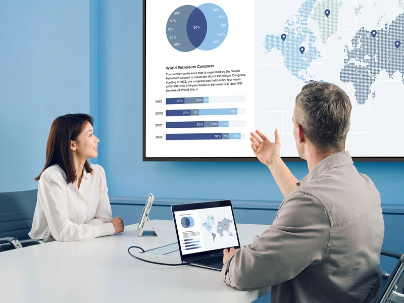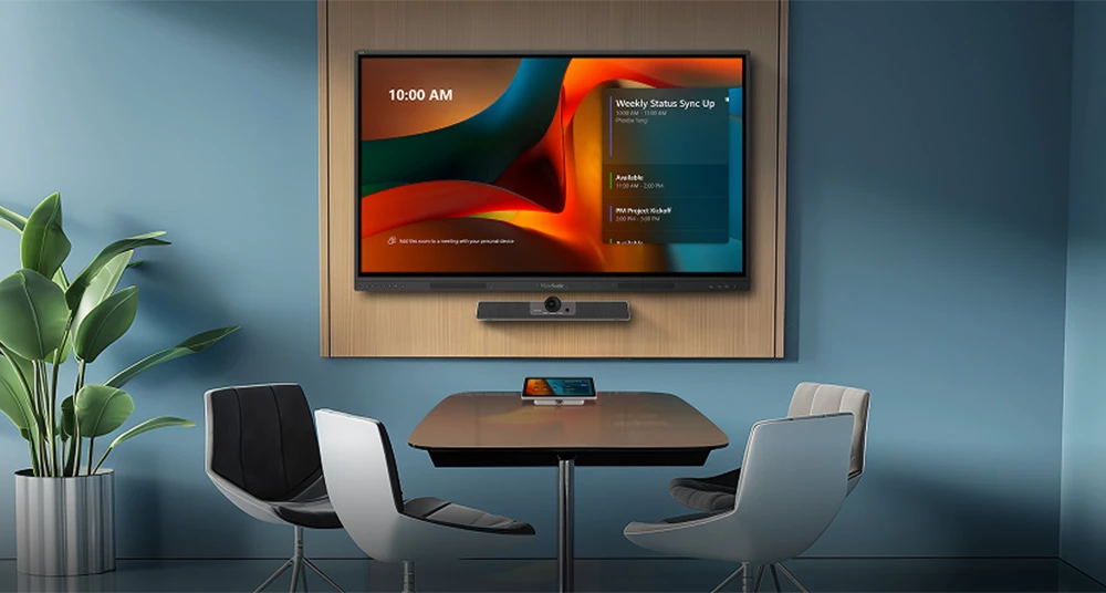 For many businesses, consumer TVs are a convenient starting point for meeting room displays. However, not all display technologies are built with professional environments in mind. A closer look at how TVs compare to commercial displays helps highlight what sets them apart. So, which one is the right fit for your business? Read on to understand the key differences between meeting room displays and consumer TVs, or explore our commercial displays. At first glance, a 4K TV and a commercial meeting room display can look almost identical. Both offer high resolution, large screens, and familiar inputs such as HDMI. The difference lies in how they are designed to perform. Consumer TVs prioritize affordability and ease of use, which works well in home environments but may not fully align with how meeting rooms are used. Commercial displays are built for professional settings, with features that support consistent performance, flexible connectivity, and integration into workplace systems. These differences may not stand out at first, but they quickly become important in everyday meeting room use. Meeting Room Display vs. TV: Comparison Here’s how these differences play out in real meeting room conditions. Duty Cycle, Lifespan, and Durability Teams use meeting room displays throughout the workday for presentations, video conferencing, and scheduling. In some environments, they run 16 hours a day or even continuously, with multiple users relying on them back-to-back. Manufacturers design consumer TVs for lighter home use. When used for extended hours in business settings, they tend to wear out faster, which can lead to dimmer screens, inconsistent image quality, and a higher risk of failure over time. Commercial displays support extended operation such as 16/7 or 24/7 use. Manufacturers build them to handle sustained workloads, which helps maintain consistent performance and reduces the risk of failure over time. Key Considerations Choose 16/7 or 24/7 operation based on how long the display runs each day Consumer TVs can wear out faster when used for extended hours Commercial displays are built to handle continuous use more reliably Brightness and Anti-Glare Readability In many meeting rooms, bright overhead lights, glass walls, or natural daylight make it harder to see what’s on screen. What looks clear in a showroom or at home can quickly become difficult to read once the room fills with light. Consumer TVs typically use glossy panels, which reflect light instead of diffusing it. In practice, this means glare on the screen, washed-out content, and people struggling to read text, charts, or shared documents from across the room. Commercial displays are designed for these environments. Higher brightness and anti-glare coatings help keep content clear and readable, even in well-lit rooms and from different seating positions. Key Considerations Aim for 450 to 500 nits in standard meeting rooms Use higher brightness for rooms with strong daylight Choose anti-glare coatings to reduce reflections Screen Size and Viewing Experience Display size directly affects how easily people in the room read content. A smaller screen may work for simple video calls, but it quickly becomes limiting when teams need to review spreadsheets, dashboards, detailed presentations, or shared documents. Many buyers choose consumer TVs based on price or availability rather than room size. Commercial displays offer a wider range of sizes. This makes it easier to match the display to the room layout, viewing distance, and type of content your team shares. Key Considerations Match screen size to viewing distance Larger rooms require larger displays Ensure all participants can read text clearly Image Quality for Business Content Business content often includes spreadsheets, presentations, documents, and interface-heavy applications. In meeting rooms, this type of content needs to stay sharp, legible, and visually accurate from across the room. Consumer TVs are optimized for entertainment rather than productivity. Their image processing can soften fine details, which makes small text, tables, and interface elements harder to read clearly. Commercial displays are better suited to business content because they prioritize clarity and precision. Accurate pixel mapping helps keep text and detailed visuals sharp, which is especially important when teams share documents, dashboards, or data-heavy presentations. Color accuracy also matters in some workflows. For design, marketing, and brand review, commercial displays provide more consistent color reproduction, helping teams evaluate visual content more reliably. Key Considerations Consumer TV Optimized for movies and entertainment Softer text and less precise details Less accurate colors Not ideal for spreadsheets, dashboards, or reports Commercial Display Optimized for business content Sharper text and clear fine details More accurate and consistent colors Better for spreadsheets, reporting, and presentations Video Conferencing Performance Video conferencing is now a core part of business communication, especially in hybrid work environments. Displays used for conferencing need to work reliably with cameras, microphones, and room systems while keeping communication clear and natural. Commercial displays are designed for this type of integration. They offer more stable performance, helping reduce lag and maintain a consistent experience across meeting rooms. Connectivity and Ease of Use in Meeting Rooms In a busy meeting room, small delays add up quickly. People plug in different laptops, switch presenters, join video calls, and expect the display to respond immediately. This is where commercial displays create a better day-to-day experience. Features such as USB-C make it easier for users to connect with a single cable for video, data, and charging, instead of relying on extra adapters or multiple connections. Commercial displays also tend to offer multiple inputs and more reliable wi
