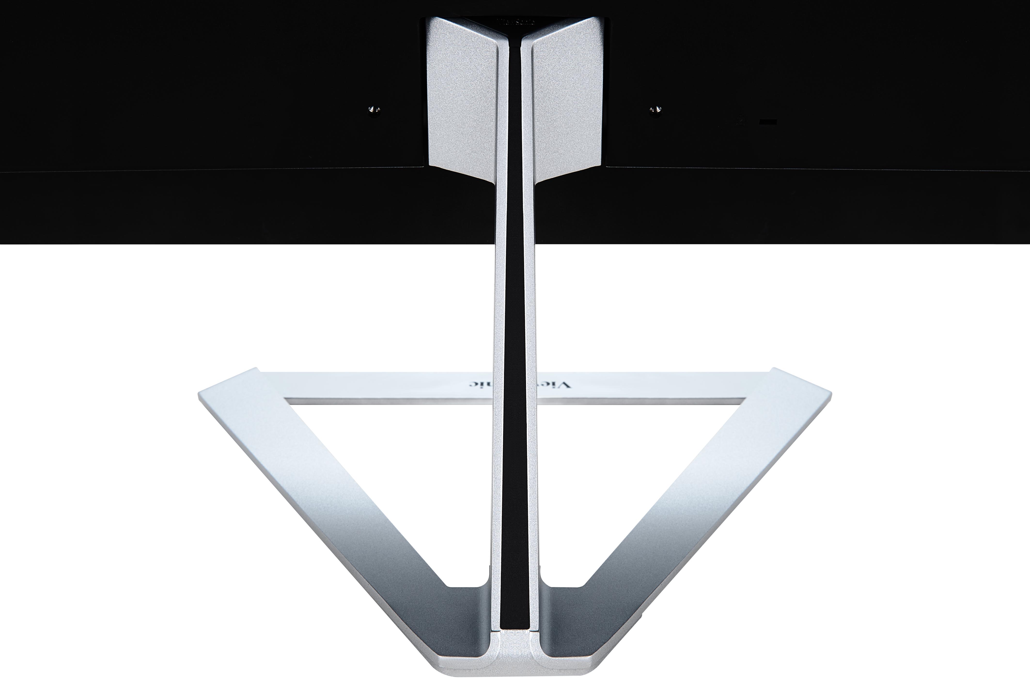 - Frameless bezel and metallic triangle stand