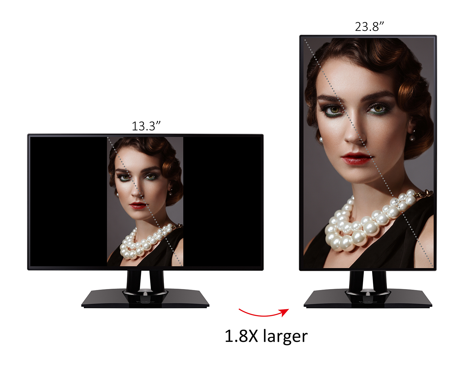 具自動旋轉功能的顯示器是一種簡單的工具,攝影師可以充分利用顯示器仔細微調縱向相片,如同編輯橫向相片。例如:在非旋轉 23.8” 顯示器上顯示的縱向相片將縮小至僅僅 13.3” 的觀看尺寸。然而,在具有自動旋轉功能的顯示器上檢視同一個影像時,使用者可將顯示器與相片方向同步以充分利用 23.8” 的顯示功能,使影像在自動旋轉後放大 1.8 倍。自動旋轉實現的顯示尺寸差異可讓使用者更深入檢視相片並透過更多控制進行編輯。