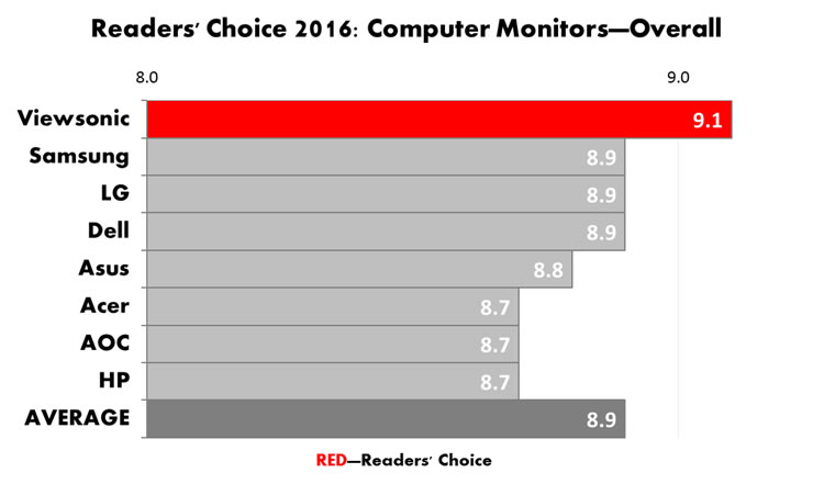 Last year, Samsung and Asus shared the Readers' Choice Award for monitors. The companies had identical overall satisfaction ratings of 9.1 in 2015, but this year Samsung dropped to 8.9 and Asus to 8.8. On the other hand, Samsung's rating for likelihood to recommend was 9.1, the same as last year and the same as ViewSonic received this year. That's a beloved brand.