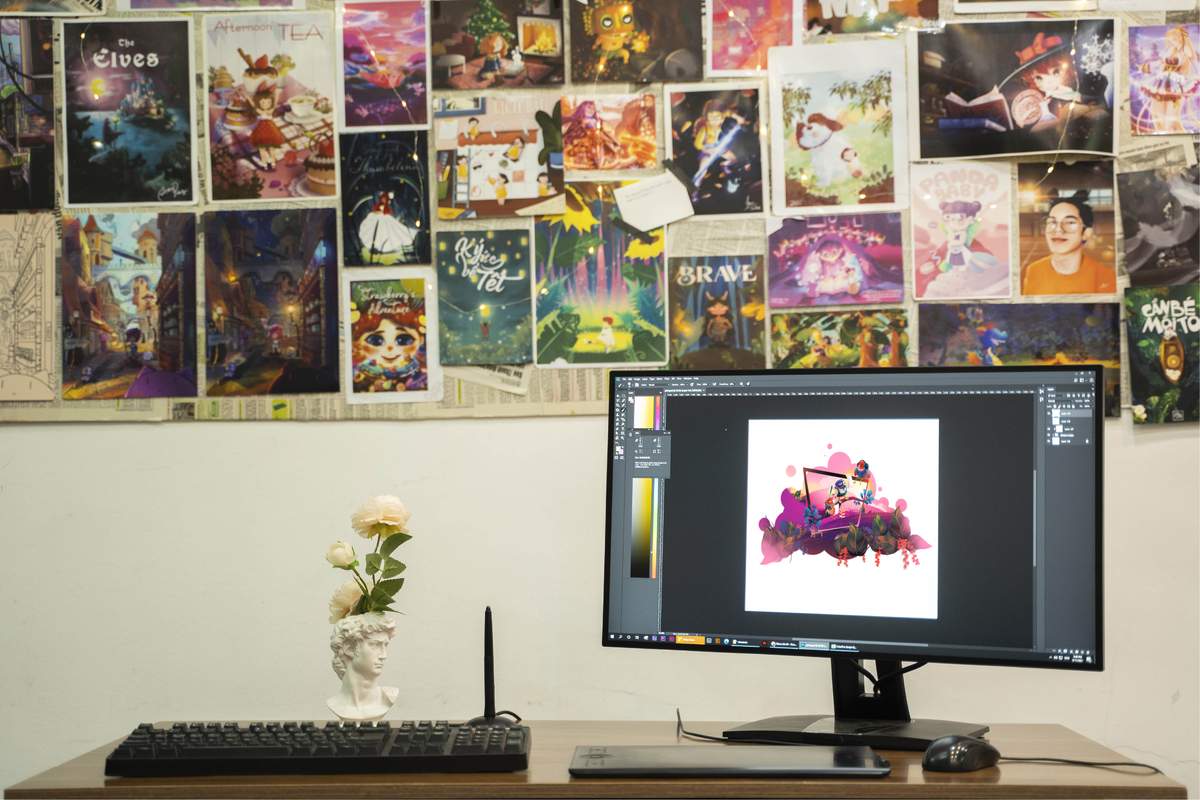Đa phần những bức tranh chuyển màu phức tạp và thể hiện sắc độ sâu trong in ấn xuất bản thì màn hình VP2768a khiến cho mình cảm thấy rất hài lòng. Với cường độ làm việc 8-10 tiếng mỗi ngày, mắt mình không hề bị mỏi với sự giúp sức của màn hình.