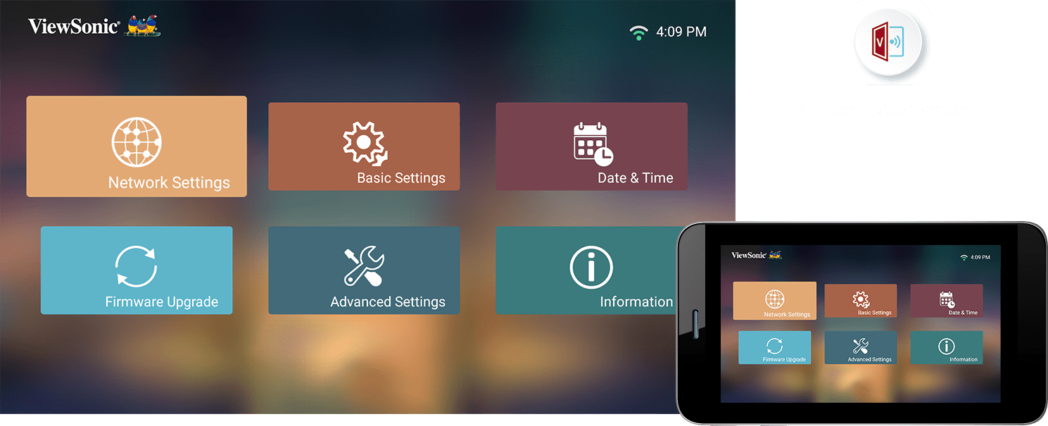 Now you can turn your mobile device into an alternative powerful remote control – intuitive touch control, easy typing, and simple annotation on the big screen. Simply download the ViewSonic vCastSender app on your phone, make sure your phone and the projector are connected to the same Wi-Fi network, and pair them up in the app to get started.