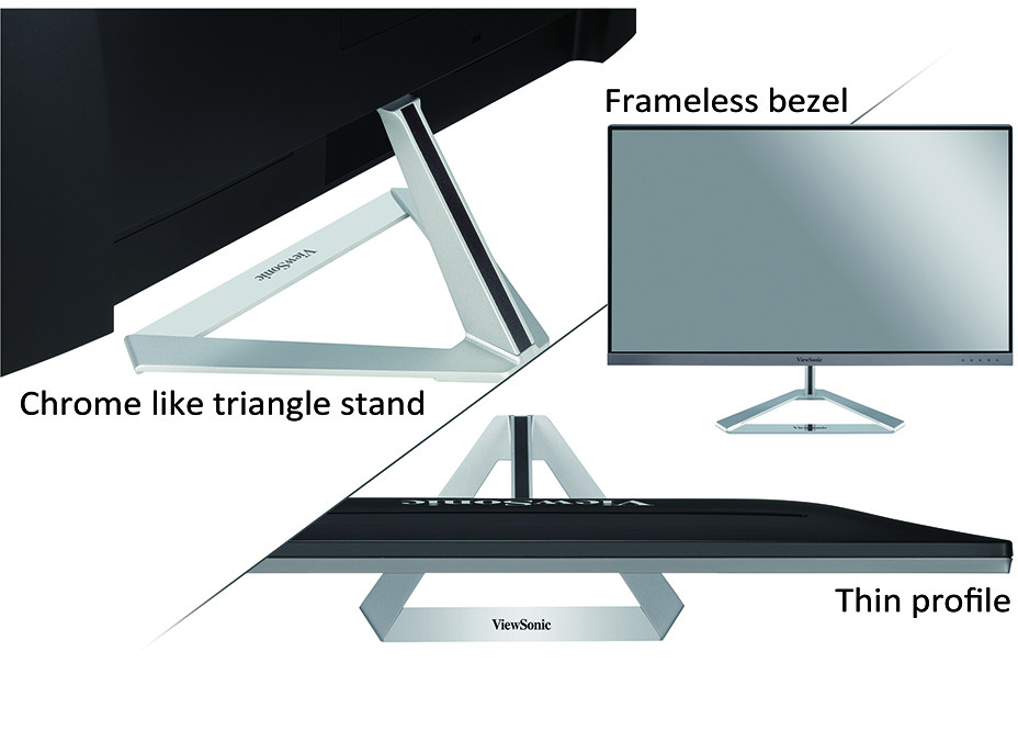 Monitor ma inspirowaną architekturą estetykę, połączoną z nowoczesnymi formami, takimi jak cienki profil, nowoczesna bezramkowa ramka i unikalna trójkątna podstawa.Cienki profil, bezramkowa maskownica, trójkątna podstawka imitująca chrom