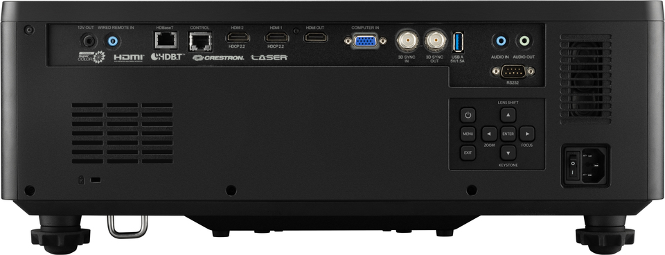 - Installation flexibility: motorized focus, 1.6x optical zoom, H/V lens shift, and 360° projection