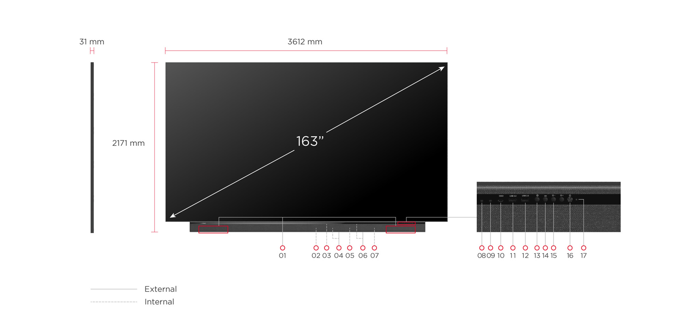 Spanning an expansive 163” screen, larger than nine 55” LCD displays combined, this frameless display seamlessly delivers content without any visible bezel stitching, creating a truly immersive visual experience. Its minimalist and sleek design, with a slim 31mm thickness, exudes sophistication that effortlessly complements any space and interior design.All-in-One Integration for Effortless Installation