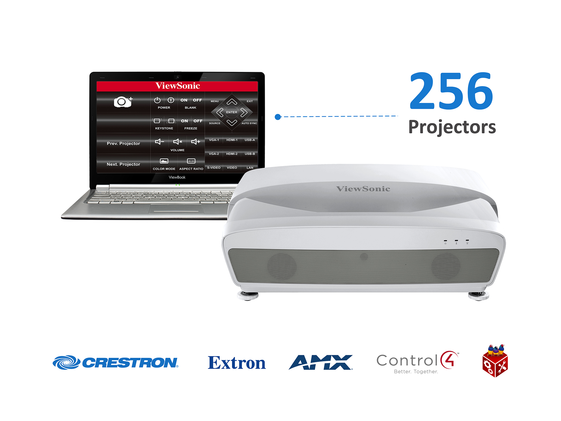 This projector comes equipped with Creston, AMX, Control4, PJ Link, ATEN, Extron, and ViewSonic vController, an easy-to-use network management tool.