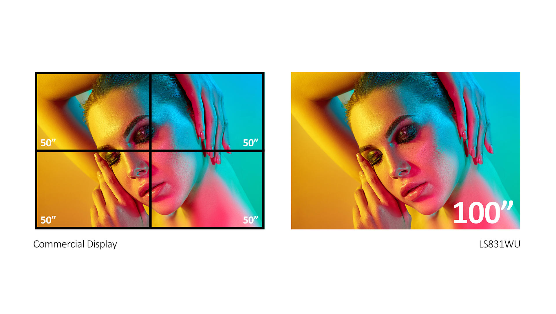 Flexible installation and effortless transportation of the projector to show a 100’’ screen in comparison to 4-way split images on 4 commercial displays that requires more manpower and money.