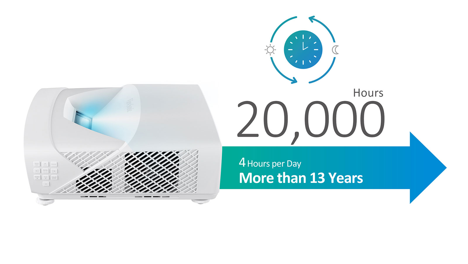 The laser technology offers a maintenance-free lifespan up to 20,000 hours (4 hours per day for more than 13 years). And the cooling design enables 24/7 operation without degradation of quality or performance.