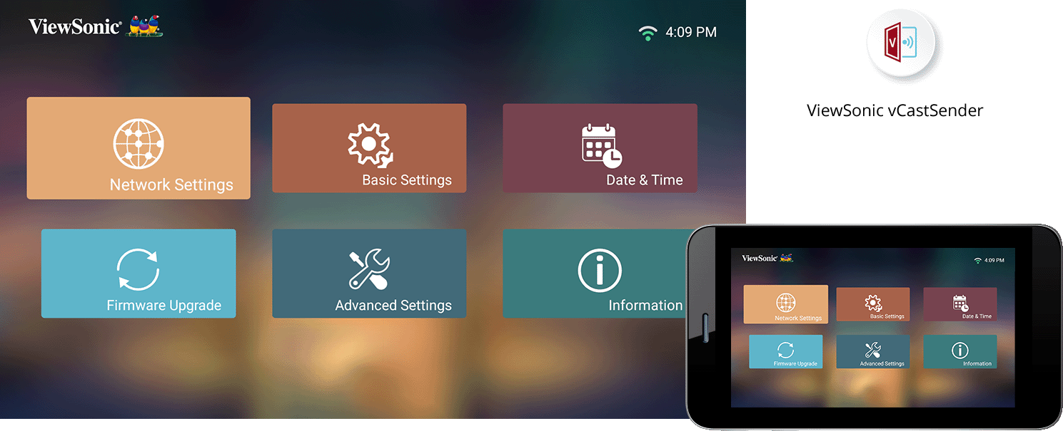 Now you can turn your mobile device into an alternative powerful remote control – intuitive touch control, easy typing, and simple annotation on the big screen. Simply download the ViewSonic vCastSender app on your phone, make sure your phone and the projector are connected to the same Wi-Fi network, and pair them up in the app to get started.