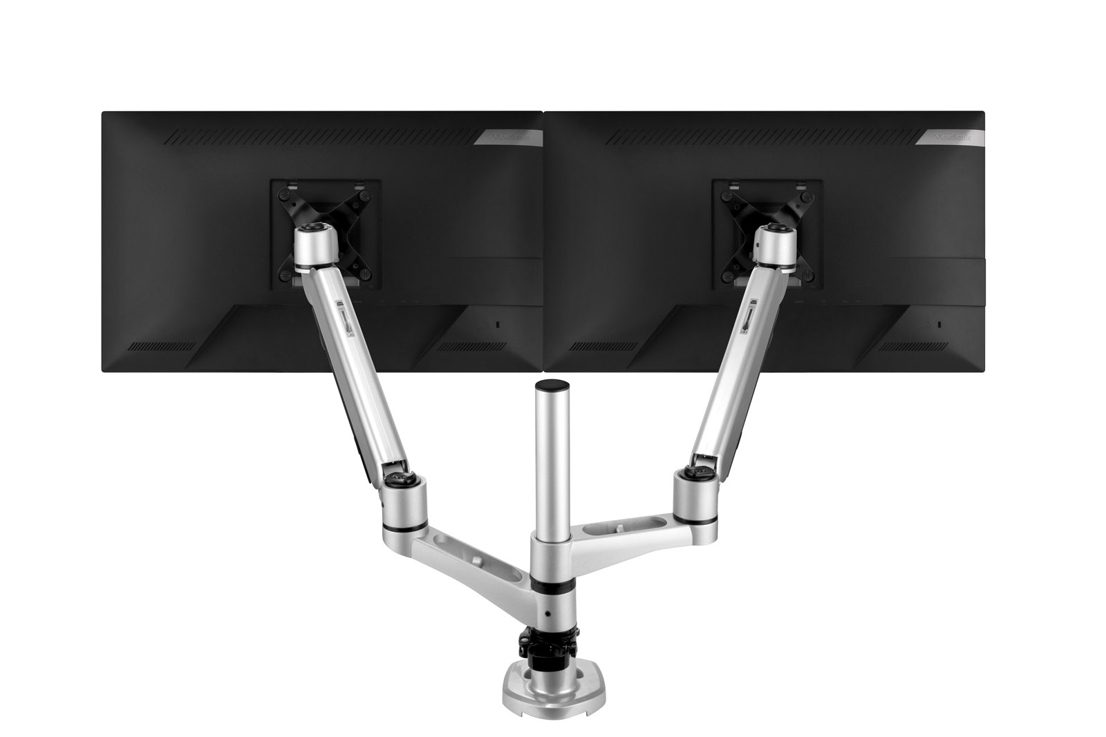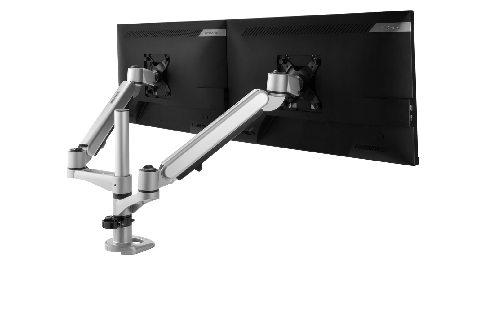 2 in 1 desk mount with clamp and grommet option that supports up to 27” monitors. The dual monitor arm can adapt to almost all types of office desks with 75 x 75mm or 100 x 100mm monitor mount that is VESA compatible, aimed to increase workspace efficiency.